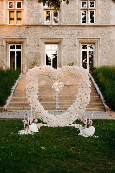 Une mise en scène féerique : Arche fleurie, chemin de pétales, bougies scintillantes... chaque élément est soigneusement sélectionné pour créer une atmosphère romantique et intime.