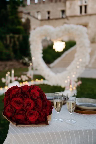 Des options personnalisables : Pour rendre ce moment encore plus spécial, nous proposons des services complémentaires tels qu’une bouteille de champagne bien fraîche accompagnée de deux coupes, un chemin de fleurs fraîches dans les tons de votre choix, un photographe professionnel, un pique-nique romantique, ou encore des lettres lumineuses "LOVE" ou "AMOUR".