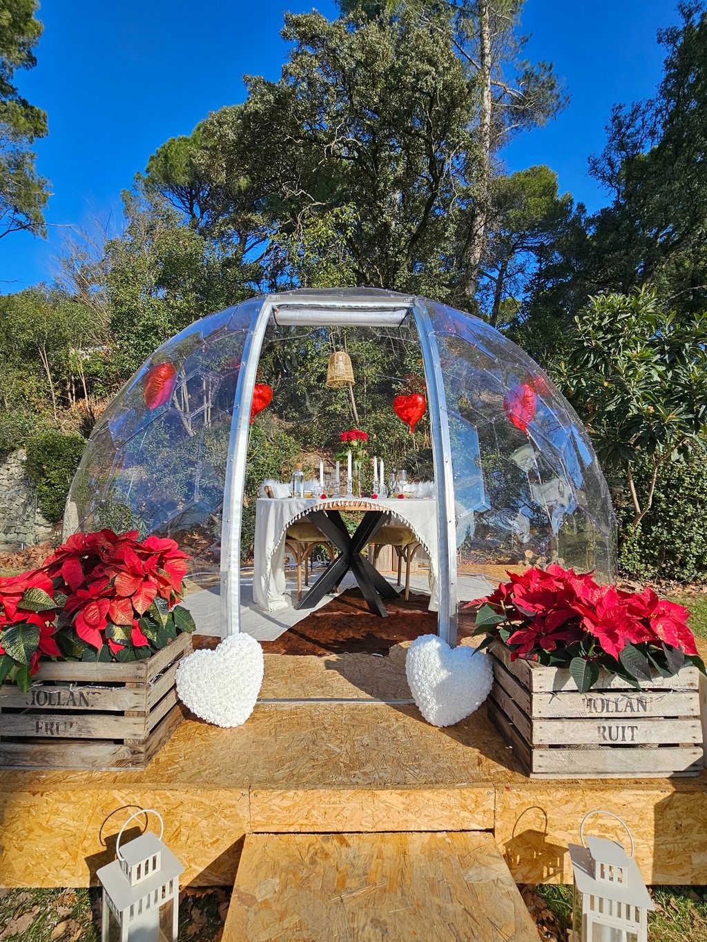 Pour une ambiance romantique inoubliable : pétales de roses, bougies, ballons en forme de cœur, et un magnifique bouquet de 10 roses rouges.